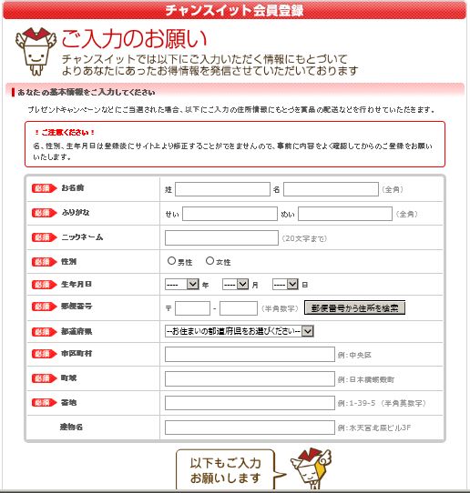 チャンスイット新規登録方法 チャンスイット 2015年01月22日 以前から気になっていたポイントサイト『チャンスイット』。気になっていたのですが仕事が忙しくてなかなか登録できずにいました。いよいよ新規で登録してみることにしました。ポイント還元率が10pts=1円なのでわかりやすい還元率ですよね!他のポイントサイトと比較すると、クリックポイントやアンケートの他に『懸賞』にも力を入れているので、更にお得なポイントサイトです。 チャンスイットに登録がまだお済でない方は下のバーナーから登録できます。このバーナーから登録すると1000ポイントプレゼント中です! チャンスイット新規登録方法 1.始めに登録する(使用する)メールアドレスとパスワードを入力します。 ※登録したメールアドレスにメルマガなどのお知らせが送信されますのでご自分で利用しやすいアドレスがいいと思います。 入力したら”会員登録へ進む”(緑のバーナー)をクリックします。 2.必要事項を入力します。 入力内容は図の通りです。名前・性別・生年月日は後から修正できませんので間違わないように気を付けてくださいね。 入力内容は ◎名前 ◎ニックネーム(サイト内で表示されます) ◎性別 ◎生年月日 ◎郵便番号 ◎住所 ◎家族構成や職業について ◎趣味やその他の情報 入力する住所ですが、チャンスイットで懸賞に当選したときに商品が発送される住所になります。 必須項目をすべて入力したら、”入力内容を確認する”をクリックします。 3.入力内容の確認 入力内容に間違いがないか確認をします。OKであれば"この内容で登録する”(緑のバーナー)をクリックします。 5.仮登録されます。 この時点ではまだ本登録になっていません。先ほど登録したメールアドレスに本登録用URLが送信されてきていますのでそちらを確認します。 6.メールの確認 メールの中に本登録用URLがありますので、そのURLをクリックします。 URLをクリックすると本登録されます。 お疲れ様でした。 このように登録をするとき個人情報が気になる方もいらっしゃると思います。チャンスイットでは個人情報を入力する際、SECOM Trust System というセキュリティーが働いており入力した内容が暗号化されてチャンスイットに送信されます。(暗号化されると、不正にアクセスされても情報を読み取られる可能性が低い) ですので、不正に個人情報を読み取られる可能性がぐんと低くなります。 優良サイトでは、個人情報を入力する際にセキュリティーを設けている場合がほとんどです。 ↓私の使用しているパソコンではこのように”キー”のアイコンが出ます。 このようにセキュリティーのアイコンが出てこない時にはちょっと注意をした方がよいでしょう。チャンスイットはしっかりとセキュリティーになっていました。 チャンスイットは安心・安全に取り組める優良サイトといって良いでしょう!! >>生活応援サイト『チャンスイット』 ☆ここから登録で1000ptsプレゼント中! [0回]PR