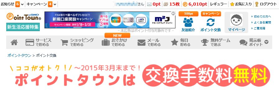 今ポイントタウンでは2015年3月末までポイント交換手数料無料でお得になっています!さっそく私もポイントタウンで貯めたポイントを楽天銀行に現金として交換することにしました。