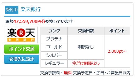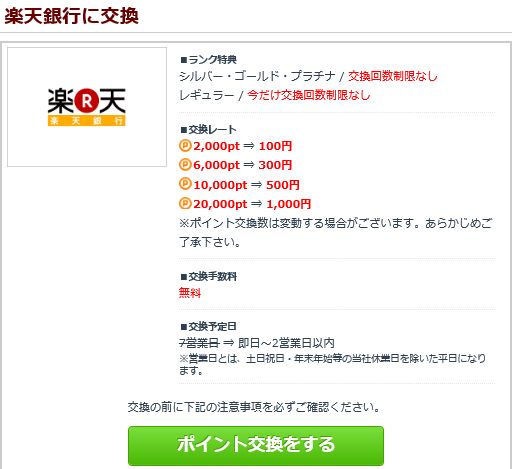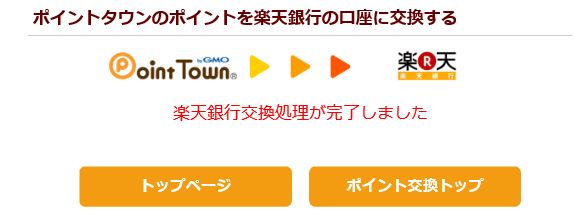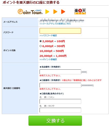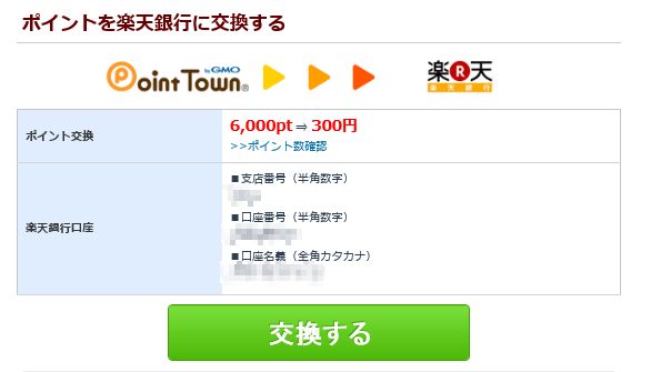 ポイントタウンのポイントを楽天銀行へ現金として交換するとき、最低2000ポイント=100円からの交換になります。100円から交換できるのもポイントタウンのひとつの魅力ですね。