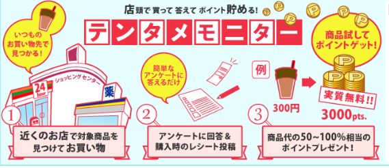 近所のお店で対象商品を購入してアンケートに回答、レシートを送信するだけで簡単にポイントがもらえます。商品の50%~100%相当のポイントがもらえます。近所で購入なので気軽に参加できるのがポイントです。もしかするとまだ試したことのない新商品などが対象になっているチャンスもあるかも!?実質無料もあります。