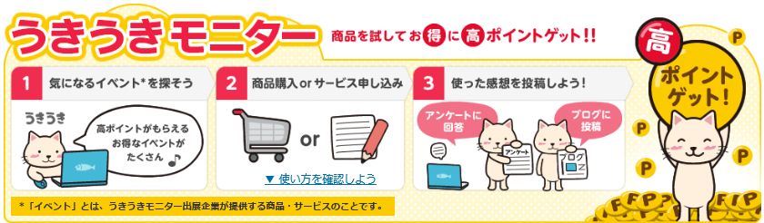 ECナビサイト内で参加したいイベントを探します。商品購入かサービスに申し込みしてアンケートまたは自分のブログで紹介することでポイントGETできます。実質無料もあるので、ブログを持っている人におすすめです!