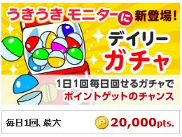 『うきうきモニター』内で参加できるガチャゲームです。1日1回無料で参加できます。アイテムを使うと高ポイントを狙えます。